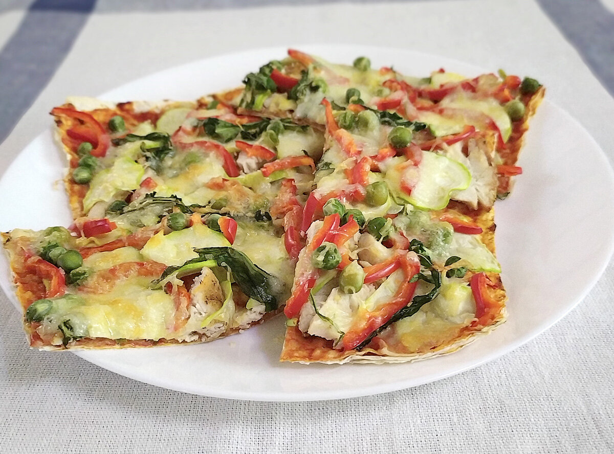 На противень кладем первый лист лаваша, слегка смазываем соусом, чуть-чуть присыпаем сыром, на него следующий. Я делаю три слоя (в середину идут обрезки от двух других слоев). Последний лист смазываем как следует соусом, укладываем тонко порезанную грудку, кабачки, перец, горошек. Сверху располагаем веточки руколы и обильно посыпаем сыром.