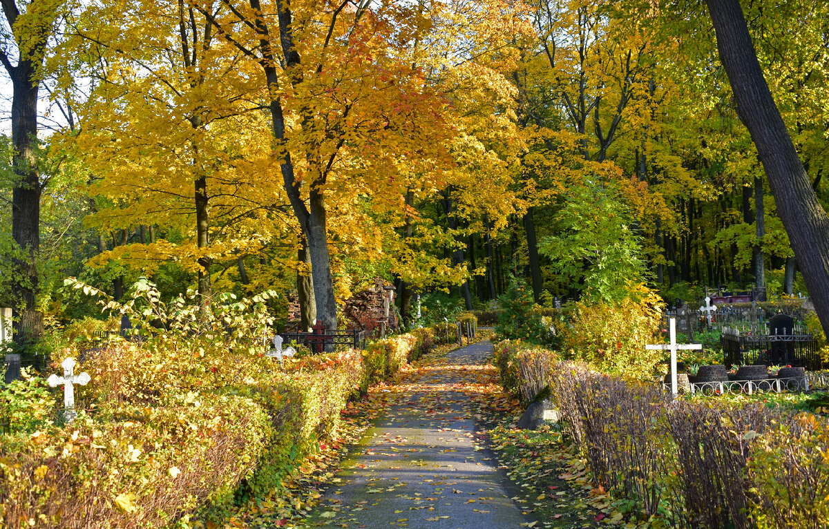 Ну и прежде чем начать предупрежу - все фото в статье сделаны лично мною, однако они будут немного различаться по времени года. Дело в том, что я ходил на Волковское кладбище дважды: в сентябре 2021 года и в октябре 2023 года (да, подготовка этой статьи изрядно затянулась - но зато я подошёл к этому основательно). Так что не удивляйтесь, что на половине фотографий листва ещё зелёная, а на другой - золотая осень в самом разгаре.