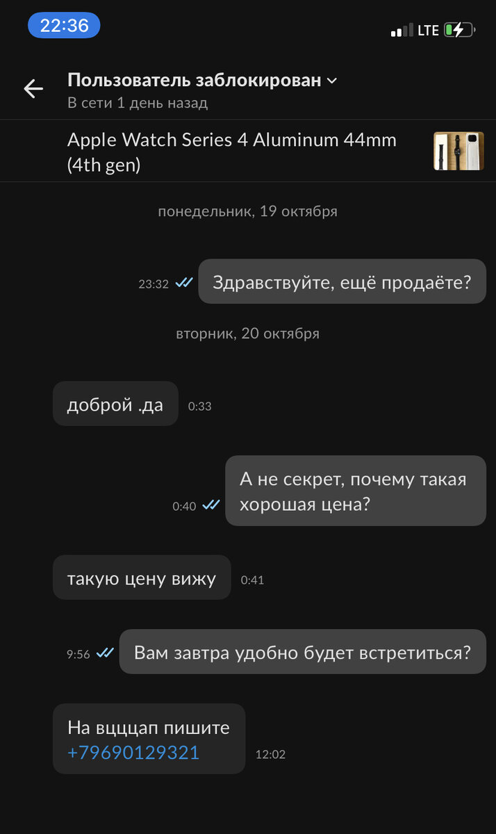 На момент покупки я сомневался в том, насколько мне нужны эти часы, поэтому решил взять б/у по двум причинам: они дешевле и если они мне не понравятся, я смогу их перепродать с минимальными потерями. Листая ленту Авито мне попалось крайне выгодное предложение, списавшись с продавцом Юлией, она перенаправила меня в WhatsApp.