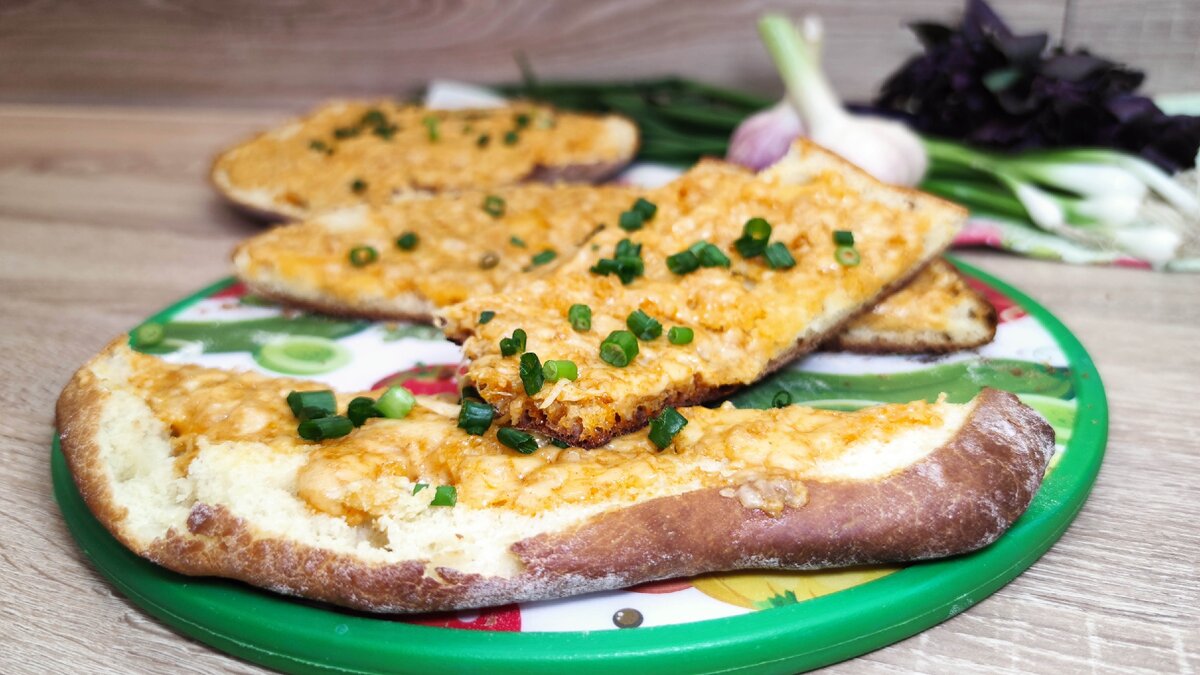 Достаем его из духовки и разрезаем пополам. Смазываем две половинки сырной начинкой, укладываем на противень и вновь отправляем в духовку еще на 5-7 минут. Посыпаем зеленью и наслаждаемся ароматным хлебом.