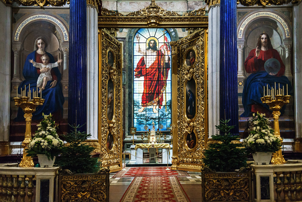 Первоначально архитектор Монферран предлагал сделать пятиметровые колонны у царских врат из целых глыб красного шокшинского порфира или яшмы российского происхождения, но Николай I выбрал дорогой привозной афганский лазурит.
