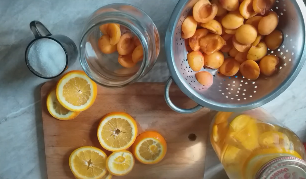 Абрикосы помыла разделила на половинки, и удалила косточки. Так же нам потребуется апельсины На одну банку 2 литра у нас уйдет 7 абрикосинок и 2 кружочка апельсина Так же стакан сахара, пол чайной ложки лимонной кислоты Итак добавляем в нашу баночку 7 абрикосинок 2 кружечка апельсина Добавляем стакан сахара и пол чайной ложки лимонной кислоты