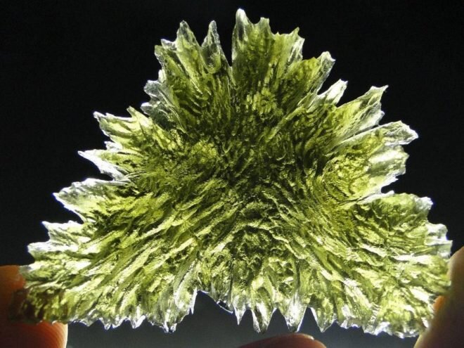 Молдавит или влтавин – стеклообразное образование, состоящее из оксида кремния с примесью оксида алюминия. Поверхность камня несёт на себе следы воздействия высокой температуры: борозды, углубления, натёки, бугорки. Для минерала характерно наличие пузырьков воздуха. Размер образцов не превышает 3 см. Самый большой экземпляр весом 285 грамм нашли около города Славице.