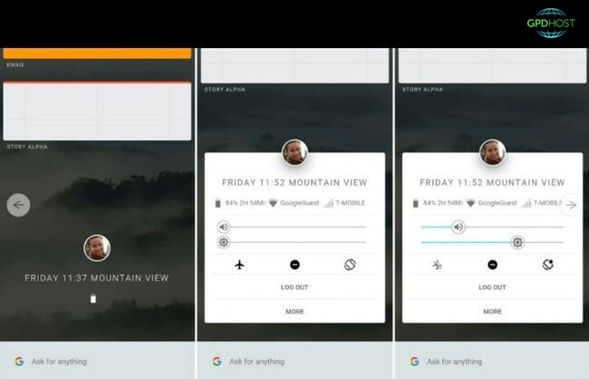 На центральное изображение профиля можно нажать, и здесь меню, немного похожее на быстрые настройки Android. Верхний ряд значков показывает аккумулятор и подключение. Ниже ползунки для регулировки громкости и яркости, а также значки для режима полета, «Не беспокоить» и автоповорота. Вы можете взаимодействовать с кнопками и ползунками, но на Android они фактически ничего не делают. Ниже находятся кнопки «выйти» и «еще», которые вообще не работают.