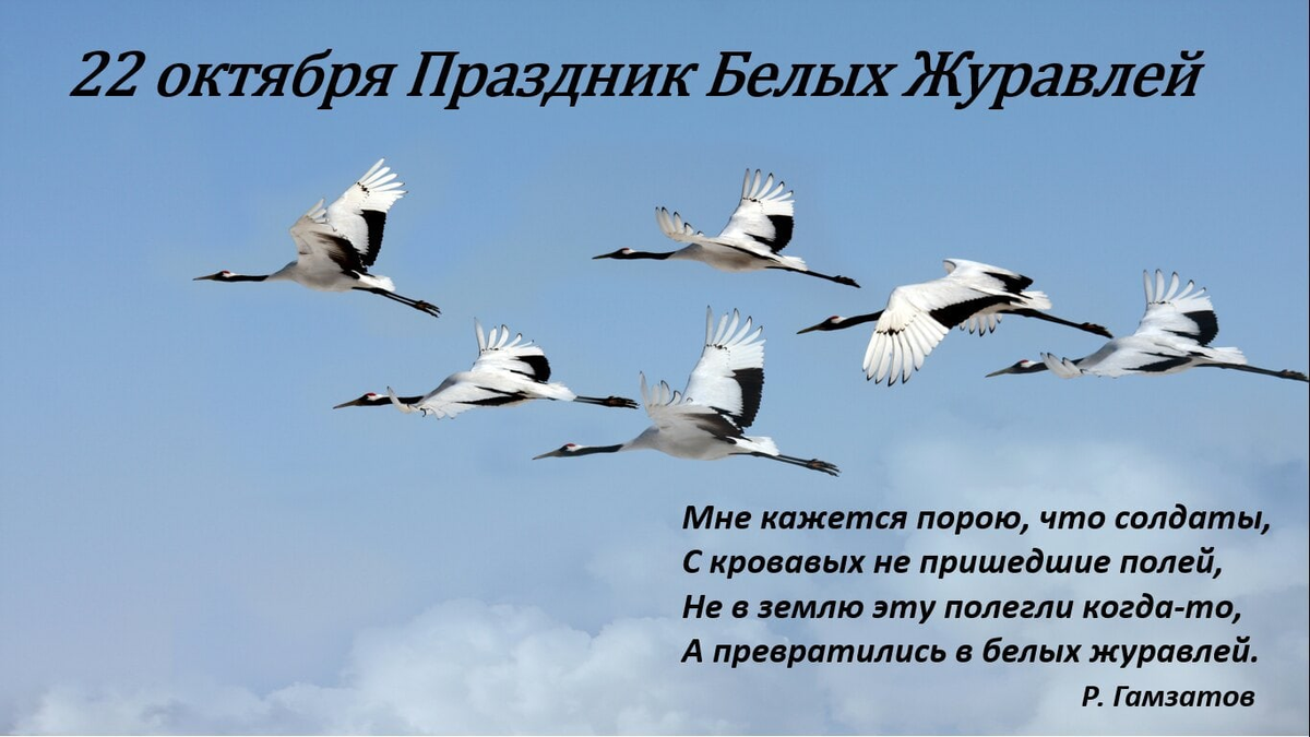 Литературный праздник «Белые журавли» учрежден народным поэтом Дагестана Расулом Гамзатовичем Гамзатовым как праздник духовности, поэзии и как светлая память о павших на полях сражений во всех войнах.Потеряны- праздники, страна - да и мы сами..