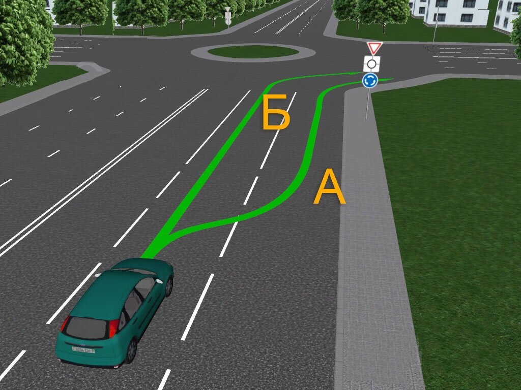 На указанном рисунке водитель имеет право заехать на круговое движение как по траектории А, так и по траектории Б. Но если на перекрестке ему необходимо повернуть направо, то он после въезда на круг должен двигаться по первой полосе. Данный маневр поворота удобнее для водителя сделать по траектории А, хотя возможно и по Б если после въезда двигаться по первой полосе.
