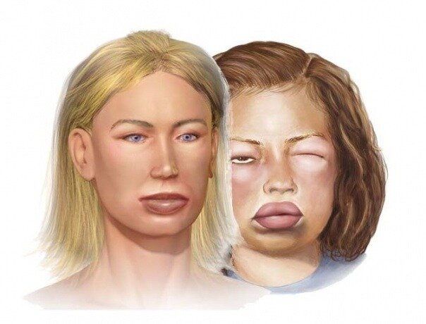Реакция начинается с увеличения мягких тканей, они распухают и становятся больше, ткани могут распухать настолько, что напоминают мяч, вместо глаз остаются узкие щели. Также отёк может распространяться на другие части тела, при попадании аллергена в пище, могут пострадать внутренние органы и суставы.