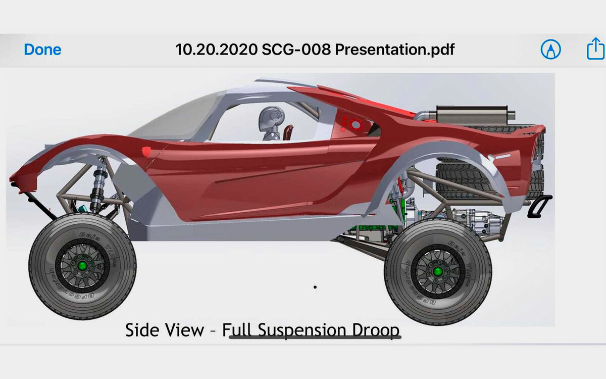 Компания Scuderia Cameron Glickenhaus (SCG), принадлежащая американскому предпринимателю Джеймсу Гликенхаусу ведет разработку необычного автомобиля, который будет представлять собой гибрид багги и суперкара. Первые изображения новинки в своем Facebook опубликовал сам