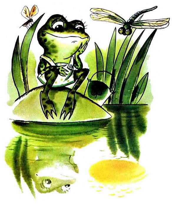 Однажды лягушонок сидел у реки и смотрел, как в голубой воде плавает жёлтое солнышко.