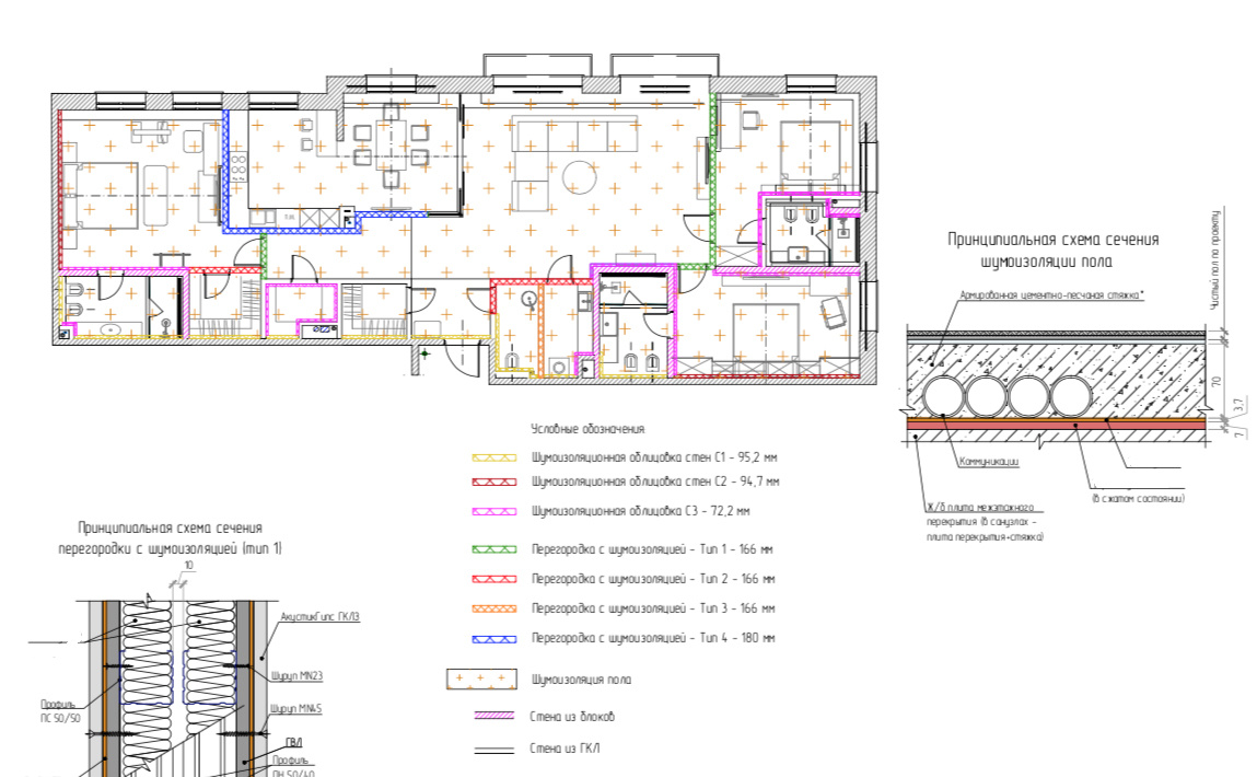 По нашему опыту, говорить о реальном акустическом комфорте можно начиная со звукоизоляции Rw=60 дБ между двумя квартирами, что на 6 дБ выше самых строгих норм, и Rw=52 дБ для шумоизоляции межкомнатных стен, что также на 5 дБ выше самых жестких для этого случая норм СП!