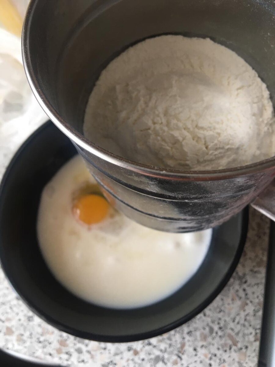 Туда же просеиваю муку и размешиваю венчиком. Муки необходимо столько, чтобы получилась консистенция сметаны.