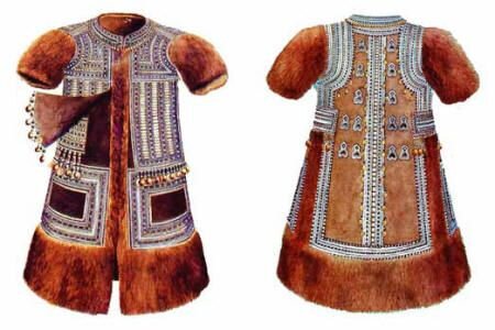 Зимнее платье якутов: теплые фуфайки, штаны, полушубки и длинные сапоги, которые носят шерстью вверх и называются торбасами. Поверх всего в дорогу надевают санаях - род тулупа из оленьих кож, тоже шерстью вверх. Во время больших морозов закрывают лоб, щеки, уши, нос и подбородок так, что только глаза остаются не закутанными.