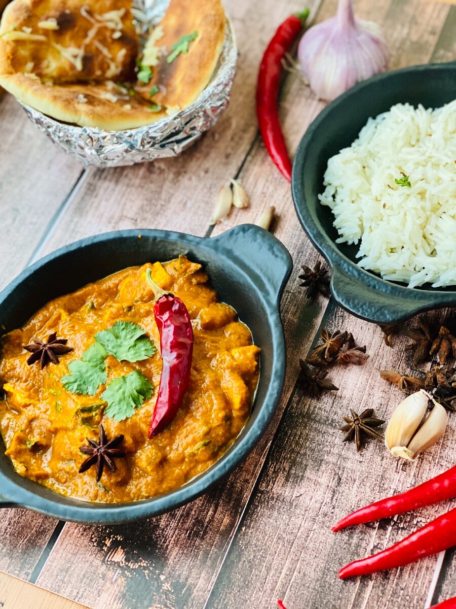 ТИККА МАСАЛА С КУРИЦЕЙ🥘, подается с рисом с зирой и лепешкой наан с сыром и чесноком
