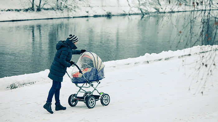 Коляска для зимы для новорожденных обычно снабжена теплой накидкой на ножки, высоким и надежным ветрозащитным отворотом, капюшоном с удлиненным козырьком. В большинстве моделей в комплекте идут дождевики, что хорошо для полной защиты во время осадков. Покрытие современных колясок, будь это текстиль или экокожа, не боится влаги, поэтому также «готово само постоять за себя». Также некоторые коляски комплектуются муфтами для рук. О родителях ведь тоже нельзя забывать :)