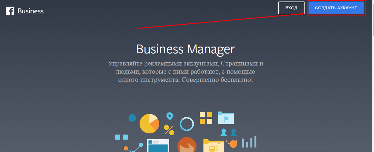 Сначала нам нужно зайти на страницу создания Бизнес-менеджера (БМ)