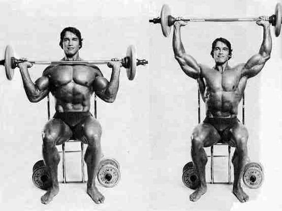 Обратимся к такому отличному базовому упражнению, как жим на плечи вверх. Его можно выполнить в 4-х различных вариантах: с гантелями/с штангой, сидя или стоя.