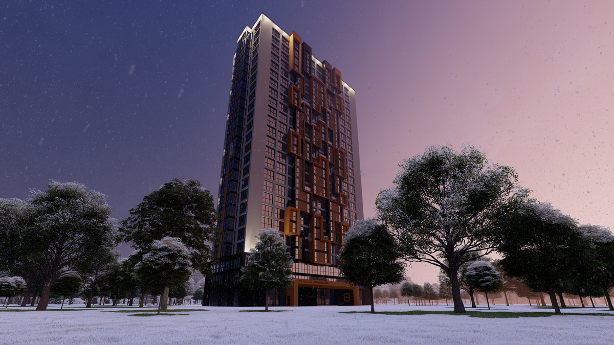 Дом состоит из 25 этажей с квартирами от 28 до 75 кв. метров. Высота потолков - 2,7 метра, а на первых этажах более 3 метров! Там же, имеются отдельные входы с улицы с двух сторон.