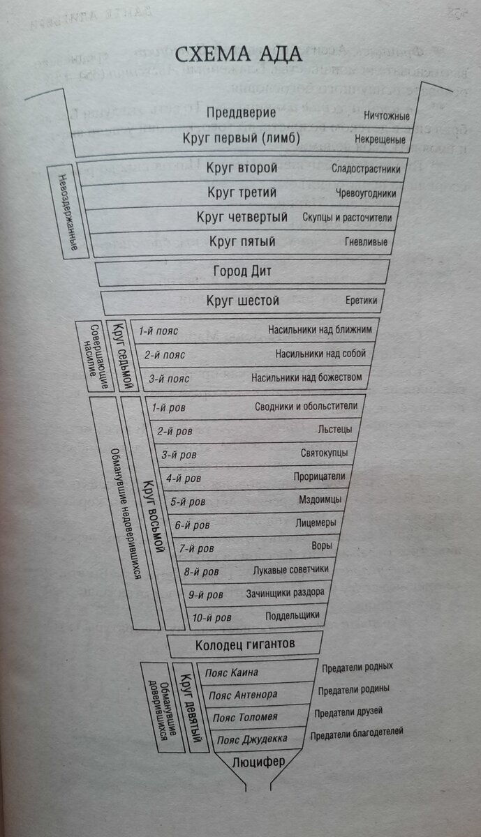 Данте Алигьери описывает ад,как 9 кругов,каждый последующий из которых имеет более тяжелое наказание для грешников.