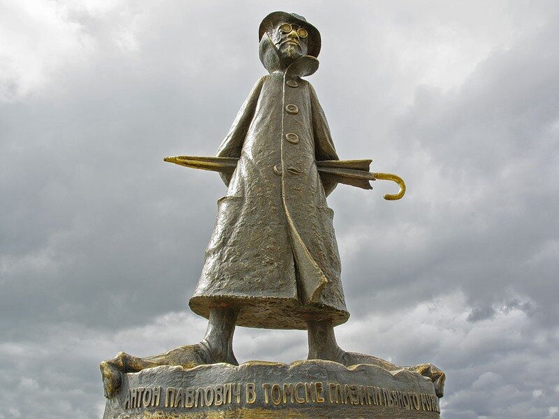 На мой взгляд, между вкусом обеда и ощутимой жёсткостью женщин нет прямой связи, но классику и ходоку виднее. Прошло сто четырнадцать лет, но гордые томчане не забыли его нелестное высказывание о родном городе. И в пику писателю в 2004 году создают удивительнейшую по своей идее, форме и содержанию скульптуру классика. Назвав ее не менее креативно « А.П. Чехов, глазами пьяного мужика. лежащего в канаве и не читавшего Каштанку. Создал двухметровую скульптуру талантливейший художник, скульптор и актер местного театра Леонтий Усов. Томчане, народ дружный и веселый. Скинулись, и Леонтий лихо слепил свой шедевр. Не советуясь ни с кем и не уверенный, что его чиновники поймут. На то он и автор. Смелый автор. Конечно, работа выполнена по доброму. Конечно, не в качестве мести, а так юмора и теплой сатиры ради. Чехов бы понял. Не обиделся. Сам прикольщиком был. Я сделал памятник зеркальным отражением, высказывания Чехова о городе - говорил Усов - Если Чехов видел город пьяным, то я сделал Чехова, каким его увидел „нетрезвый город“. Это напоминание нам, что нас посетил великий гений»