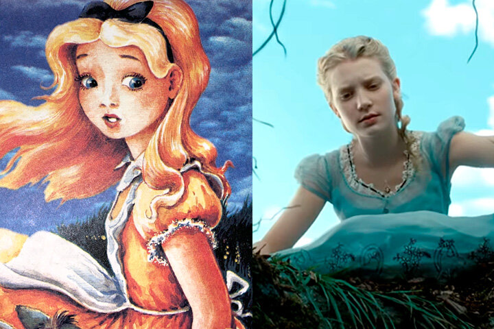 В экранизациях главной героине чаще всего выбирали не детей, а уже подростков, так как маленький ребенок вряд ли мог запомнить так много текста. Фильм Тима Бертона не стал исключением. Так на экране появляется юная светловолосая девушка, с милыми чертами лица и миниатюрной фигурой. Ее образ отличается от оригинала тем, что в фильме она жизнерадостна и оптимистична, в то время как персонаж книги такими качествами похвастаться не может.