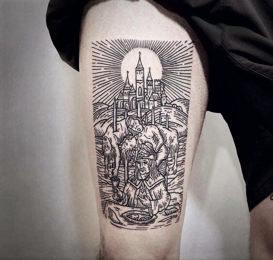 Гравюра - не самый редкий, но не очень популярный стиль татуировок. Тату в этом стиле выглядит будто её выгравировали на жестком материале (железо, дерево и др.). Основная тематика данного стиля это средневековый фольклор, например различные гербы, фрески, изображения мифических героев и чудовищ.