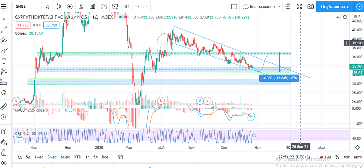 На данном графике видно, что бумага формирует формацию клин. На пробитие уровня поддержки 32.60-33.70 можно присмотреться и взять данную бумагу в спекулятивных целях, дабы отработать формацию клин.