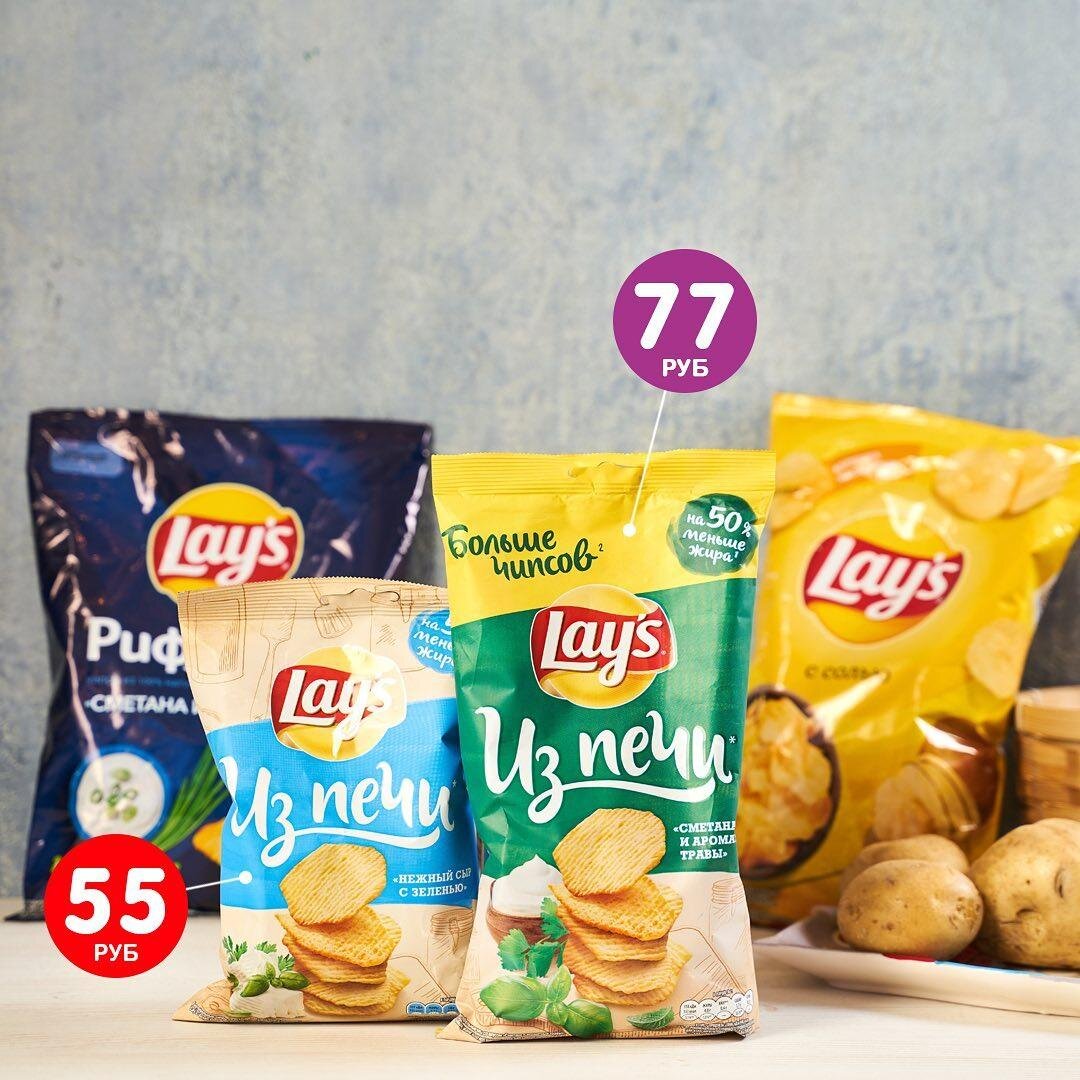 💥 Lays из печи — 55₽ или 77₽ в зависимости от размера пачки.