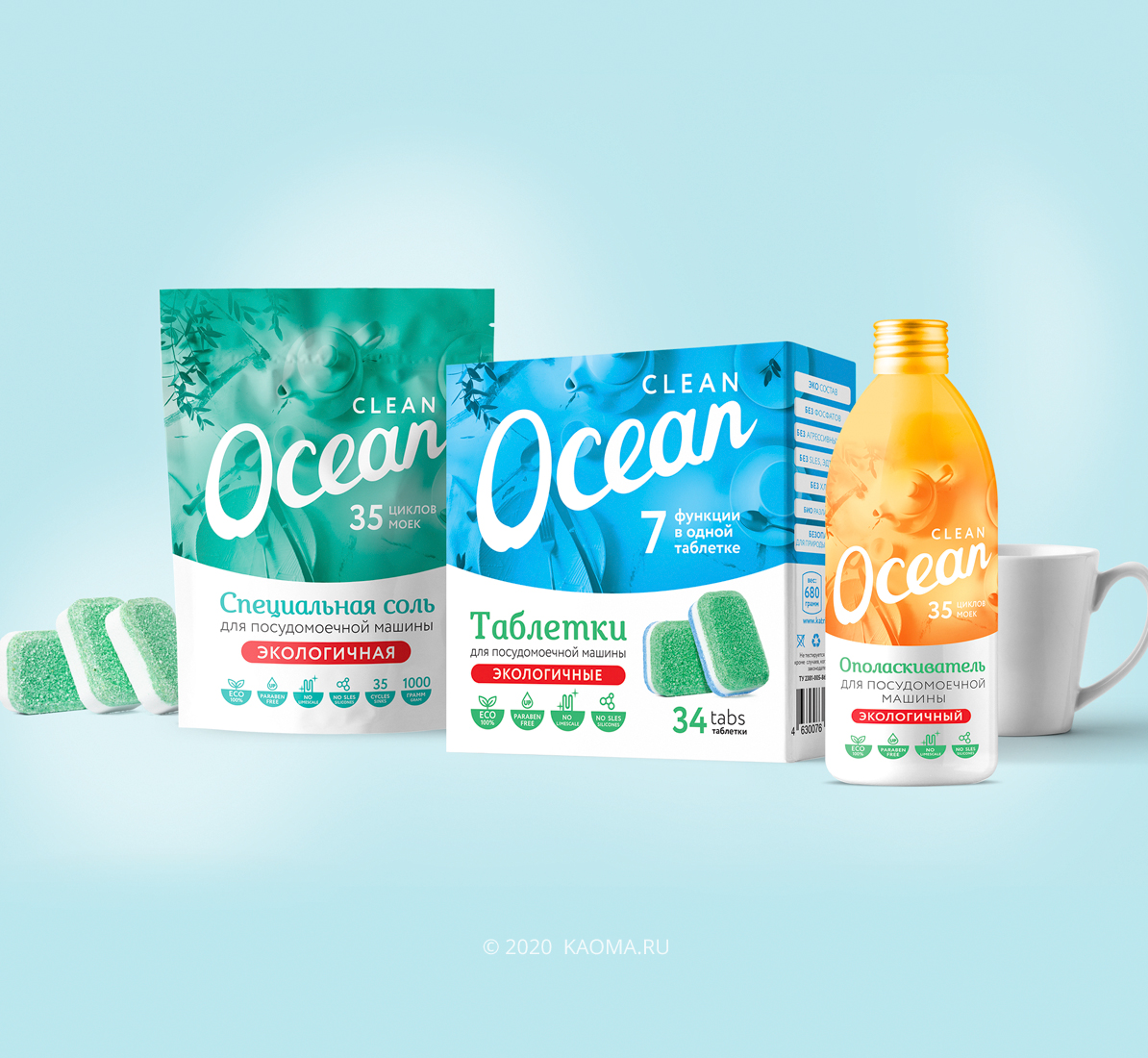 Летом 2020 года наша компания разработала серию средств для посудомоечных машин и средств для уборки под общим брендом «Ocean Сlean». Заказчиком выступила компания «Лаборатория Катрин». Местом реализации продукции были определены торговые площадки гипермаркетов.