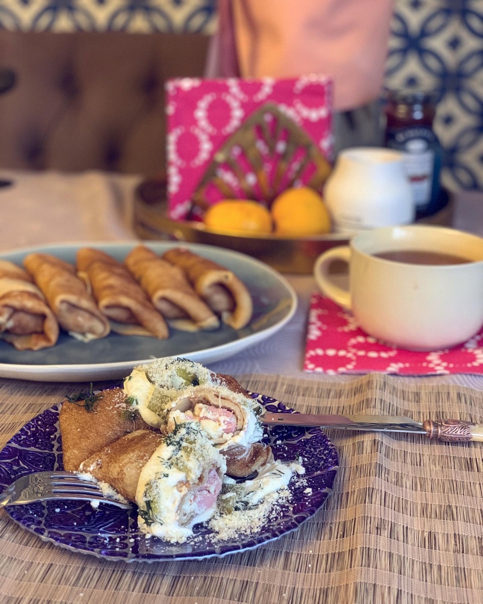 Подавать блинчики нужно с соусом. Например, приготовьте "тар-тар": порежьте мелко соленый огурец, зубчик чеснока, укроп и смешайте это с 150 г любимой сметаны. И, конечно, не забывайте о красивой посуде и сервировке стола, ведь есть в такой атмосфере гораздо приятнее. Себя нужно баловать!