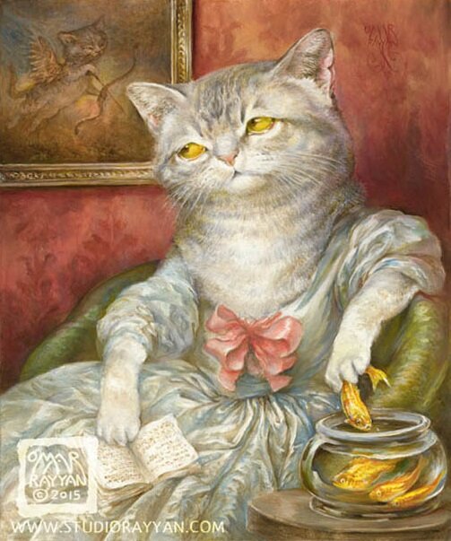 Здравствуй, читатель! Читать сегодня будем по-минимуму, больше смотреть и разглядывать - ведь суббота же! Надо дать отдохнуть напряжённому разуму, а лучше всего для этого подходит разглядывание котиков... Вот таких, например: Но с кошечки этот арт-обзор я начал не только из-за субботы. Идею такой художественной подборки мне подарила одна любимая Мурочка, за что её спасибо и чашечка капучино! Познакомлю желающих такого знакомства с супружеской парой иллюстраторов - Омаром и Шейлой Райан. Живут они на острове Мартас-Винъярд, что в американском штате Массачусетс. И вовсю там занимаются творчеством. Омар рисует в основном акварелью, совмещая в своих рисунках несовместимое - ренессанс и фэнтези. В результате выходит нечто невообразимо оригинальное, странное и завлекательное. Посмотрите галерею, только вдумчиво - символизм у Омара тоже имеет место быть: Но, кроме кошечек и прочих зверушек, попавших в довольно человеческие и средневековые условия существования, Омар Райан рисует и совершенно