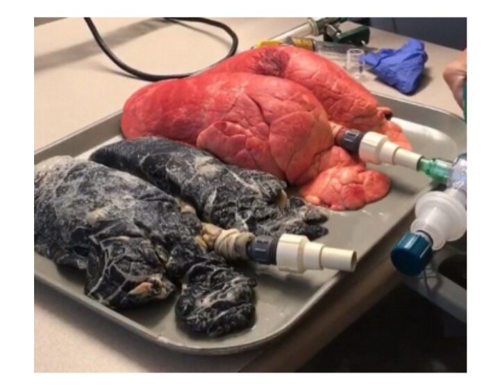 На записи видно, как медсестра накачивает воздухом здоровые лёгкие и орган человека, который выкуривал по пачке сигарет в сутки в течение 20 лет.