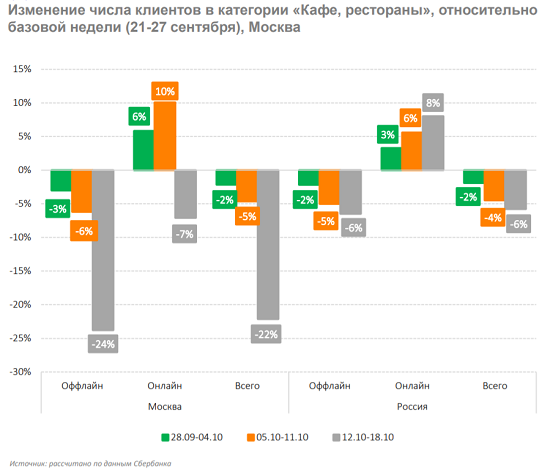 Так, по результатам исследования IT-компании «Эвотор» обороты ресторанов и кафе Москвы с 1 по 15 октября оказались на 20% ниже, чем за аналогичный период прошлого года. Средний чек