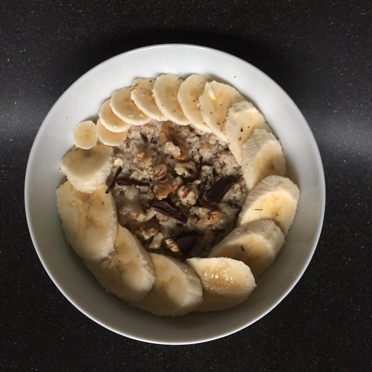 Овсяная каша на воде с бананом, грецким орехом и горьким шоколадом.