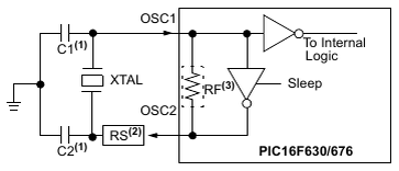 В целом, тут абсолютно стандартная схема подключения внешнего резонатора. Вот фрагмент из документации для PIC. Просто по той причине, что он наиболее наглядный