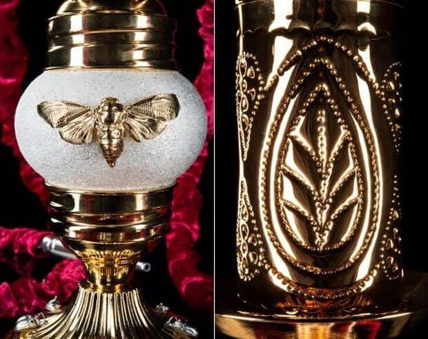 1. Список возглавляет компания из Швейцарии "AurentumSwitzerland". Она продает золотой (в прямом смысле слова) чудо-кальян. Все части модели изготовлен из драгоценного металла: колба из золота 18 карат; мундштук с родия и серебра; шланги из венецианского бархата; вдоль и поперек украшенный