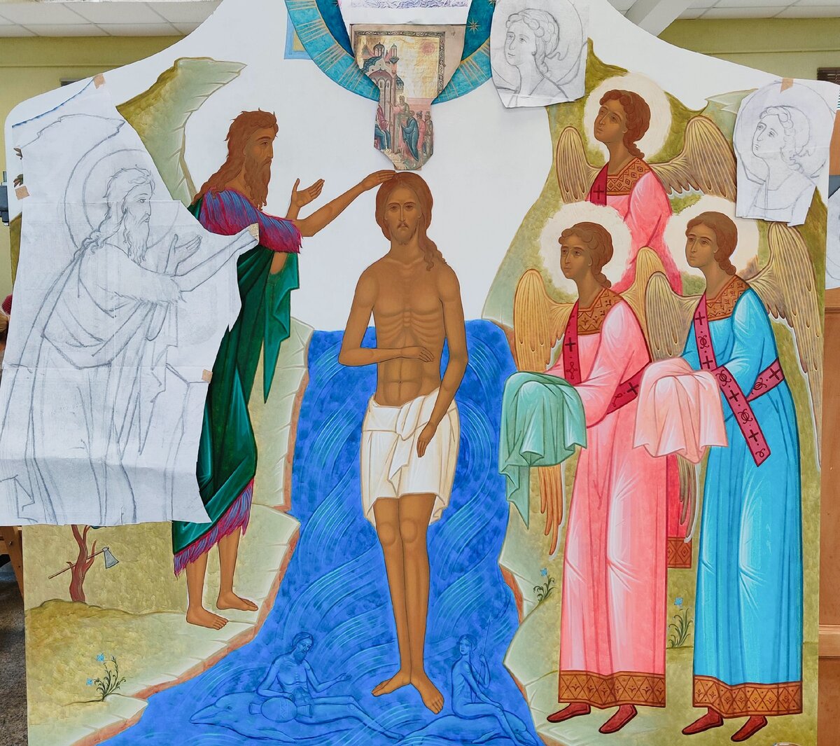 Иконостас в Крестильном храме должен привлекать детское внимание яркими, красочными тонами. Среди всего неизведанного, а потому страшного для младенца (а именно так он воспринимает впервые атмосферу нового помещения и людей) должно быть что-то близкое родное, успокаивающее.