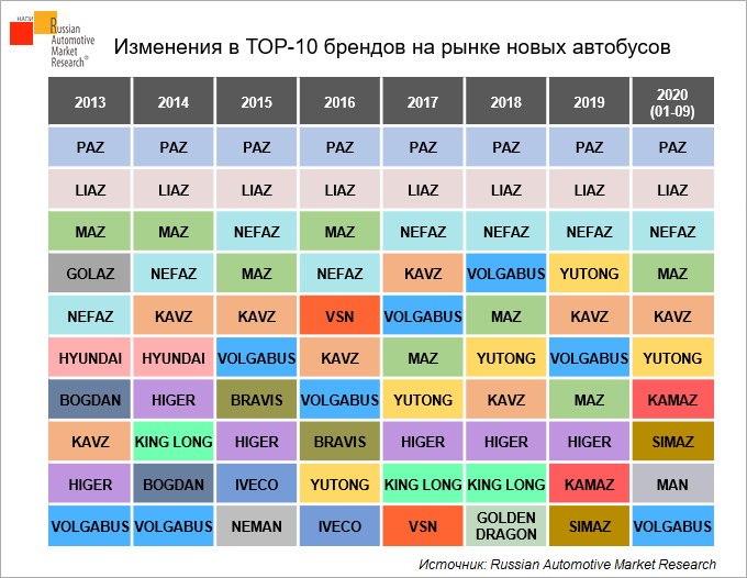 С 2017 года в тройку лидеров стабильно входят автобусы марки NEFAZ. Также прочно держатся в первой десятке бренды MAZ, KAVZ и VOLGABUS.