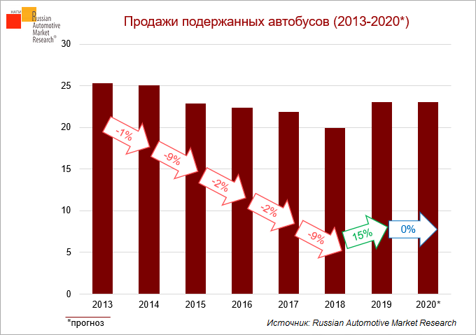 Рынок автобусов с пробегом падал с 2013 по 2018 год, однако в 2019 году продажи выросли на 15%. По прогнозу RAMR, продажи автобусов с пробегом по итогам 2020 года останутся на уровне результата 2019 года.