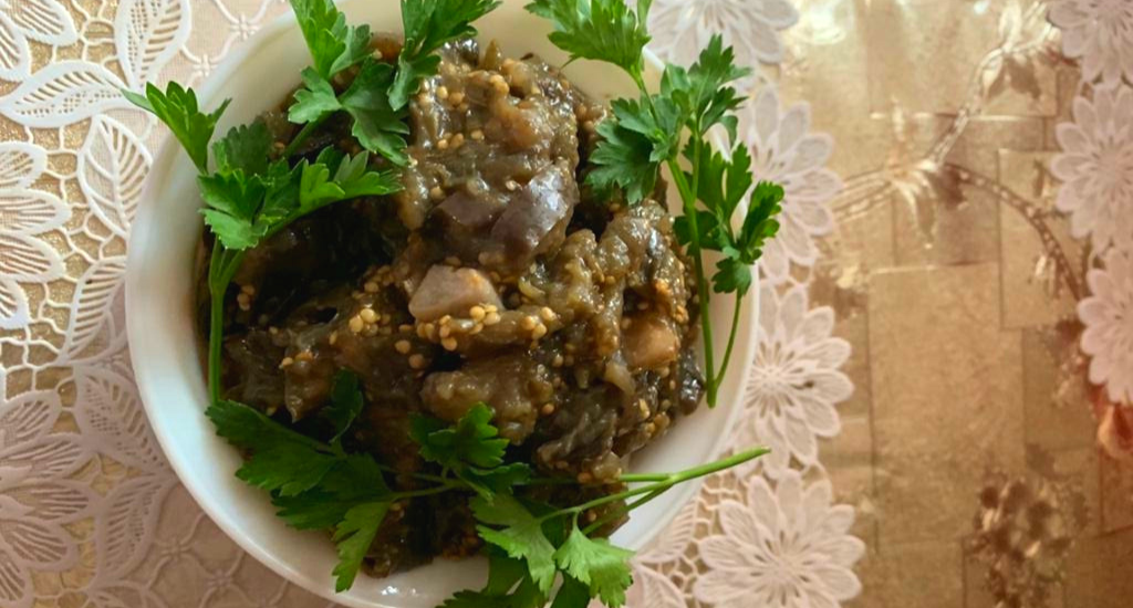 - затем в миске смешать отварные баклажаны и специи: 2-3 лаврового листа, 5-6 горошин черного душистого перца, 2 дольки мелко нарезанного чеснока. Смешать и выложить в чистую банку.