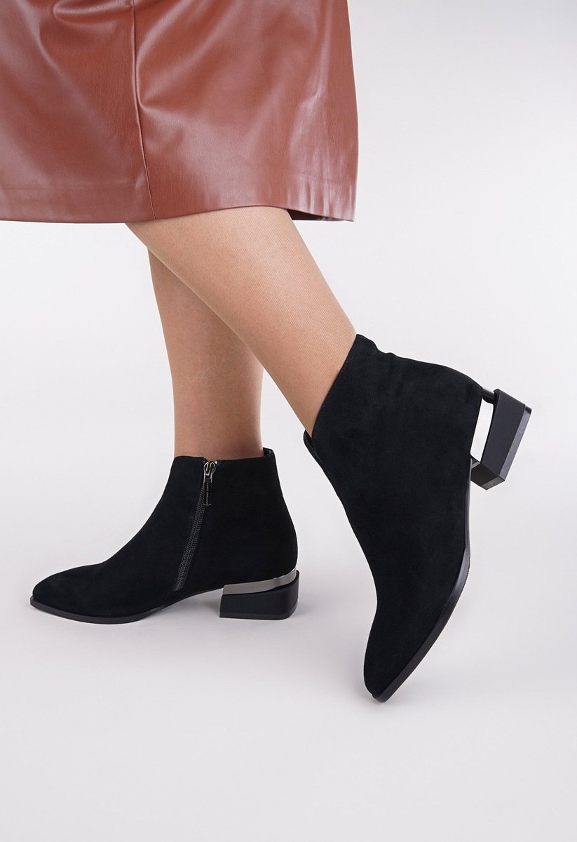 Обзор начинают ботильоны из лимитированной коллекции из замши черного цвета. Эта модель изящно подчеркнет ваш изысканный вкус. Изюминка - составной каблук с металлической накладкой.