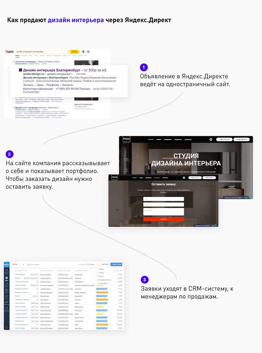 Перед тем, как запросить у пользователя телефон, мы просим его пройти небольшую викторину: спрашиваем о сроках, бюджете на проект, количестве комнат в квартире.