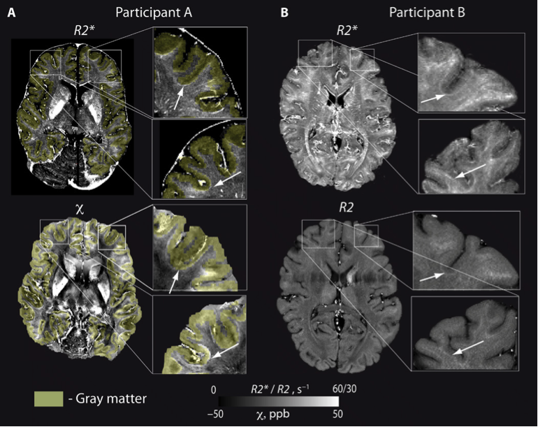 Количественная карта железа (А) и карта расчетной объемной доли миелина. Стрелка указывает тонкую (0,5 мм) полоску SWM. Credit: Evgeniya Kirilina, et al. / Science Advances 2020