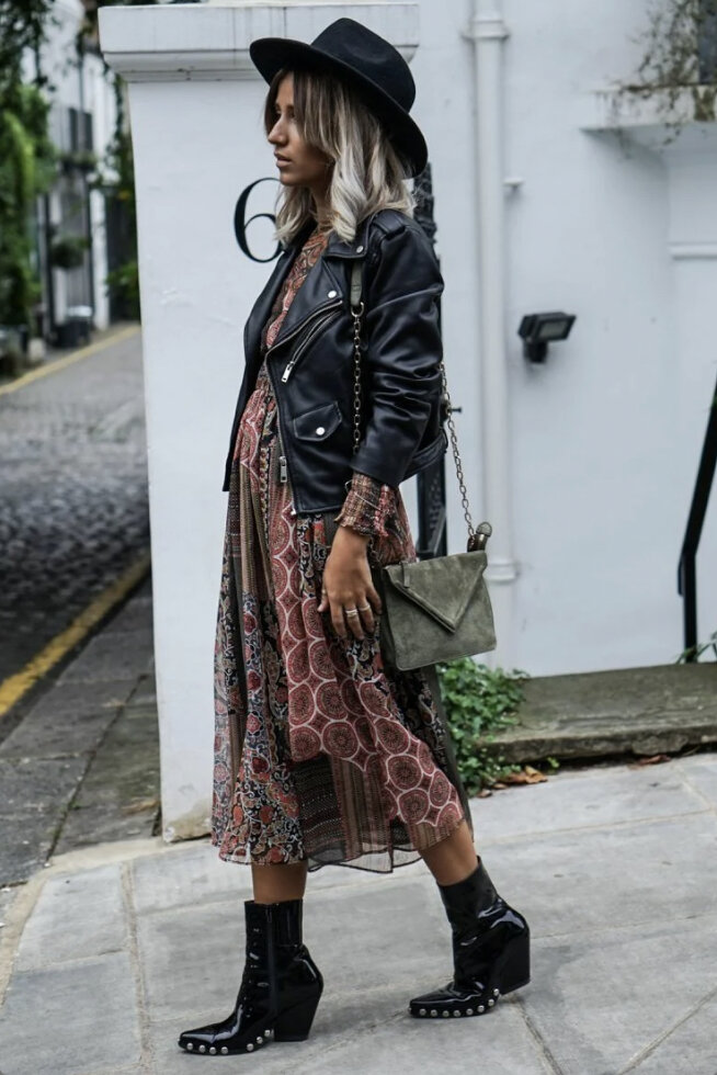 Бохо-платья классно смотрятся с фетровой шляпой, кедами или казаками и сумкой через плечо. Сверху мы рекомендуем надеть оверсайзную кожаную куртку, свободный тренч или пальто нейтрального оттенка.