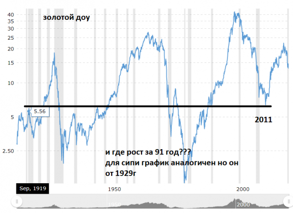 Опустим немой вопрос: почему был выбран именно индекс DJI, ведь на него особо никто не ориентируется в современном мире (к слову с S&P500 картина выглядит похоже, так что ладно). Не будем также обращать внимания на то, что был выбран локальный максимум в 1919 и локальный минимум в 2011 (чего только не сделаешь ради подтверждения собственной правоты). При том, что если взять реальных 100 лет и принять во внимание, что график отображён в логарифмическом масштабе, то получается, что DJI всё таки вполне себе увеличил стоимость в золоте в 3,7 раза.