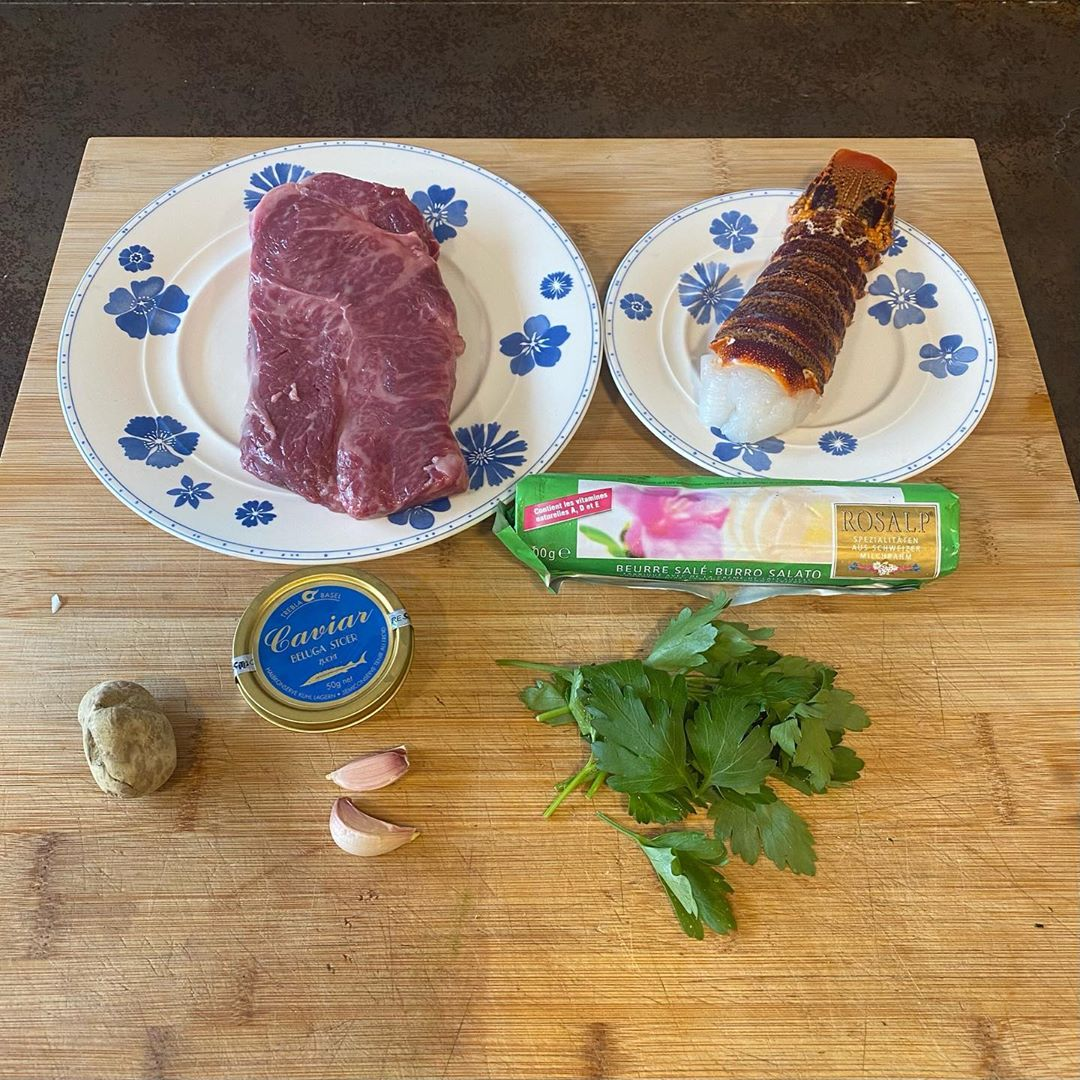 Приготовил Surf&Turf: мраморную говядину с лангустином, трюфелем и черной икрой