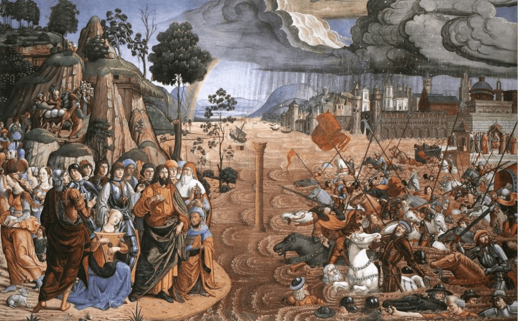 Перешедшие по морскому дну Израильтяне видят гибель фараона с войском в пучине морской. Их охватывает радость, они благодарят Бога, хвалят, прославляют и воспевают Его.