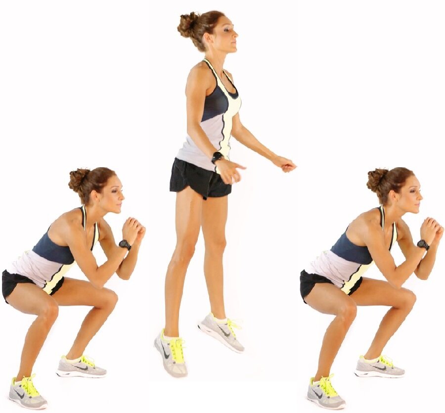- Из этого положения выпрыгивайте вверх, поднимая руки;