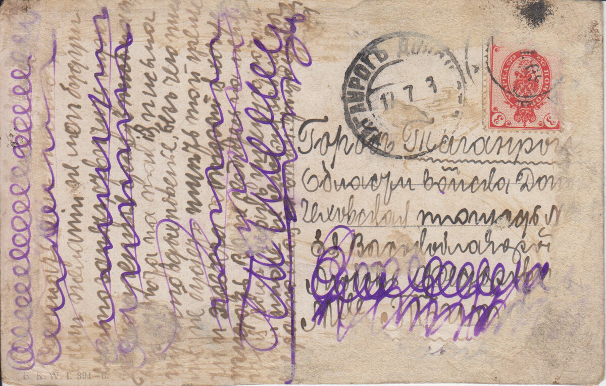 Разобрать это письмо было не просто. Многие строки старательно зачириканы. Даже казалось, что кроме адреса ничего не понять. Однако после внимательного изучения стало очевидно, что чувства пишущих друг-другу людей проходят некоторое испытание, но что и к чему пока не понятно. Возможно однажды вернемся к более подробной расшифровке этого письма от 1909 года.