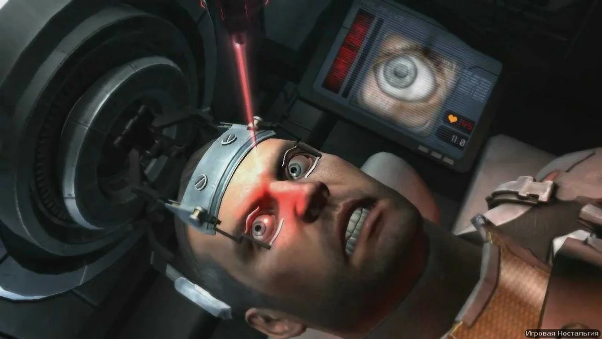 сцена превращения в строгга из игры Quake 4. В 2005 году это была настоящая жесть, притом с передовой на тот момент графикой. Если вы не в курсе, строгги — это такие инопланетяне, которые захватывают людей и превращают их в своих солдат. Не повезло и главному герою: его тоже схватили и положили на конвейер. Весь процесс превращения показывается от первого лица: тут вам и здоровенные иглы, и даже отрезание ног огромной циркулярной пилой. Даже сейчас на это неприятно смотреть, а вы представьте, каково это было в 2005 году!