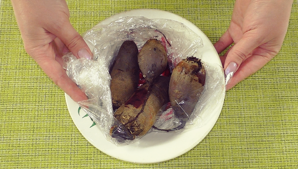 Варим свёклу (быстрее в микроволновке: кладем в пакет для запекания, завязываем, делаем в нём несколько отверстий, и готовим 8-10 минут при высокой мощности, у меня 800 Вт. свёкла в этот раз у меня не крупная, мне хватило на приготовление 8-ми минут. Остужаем.